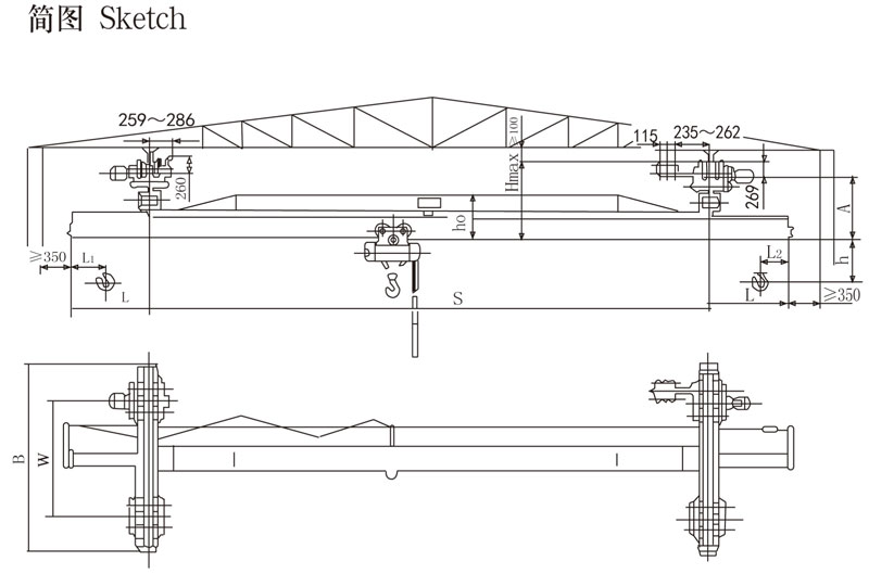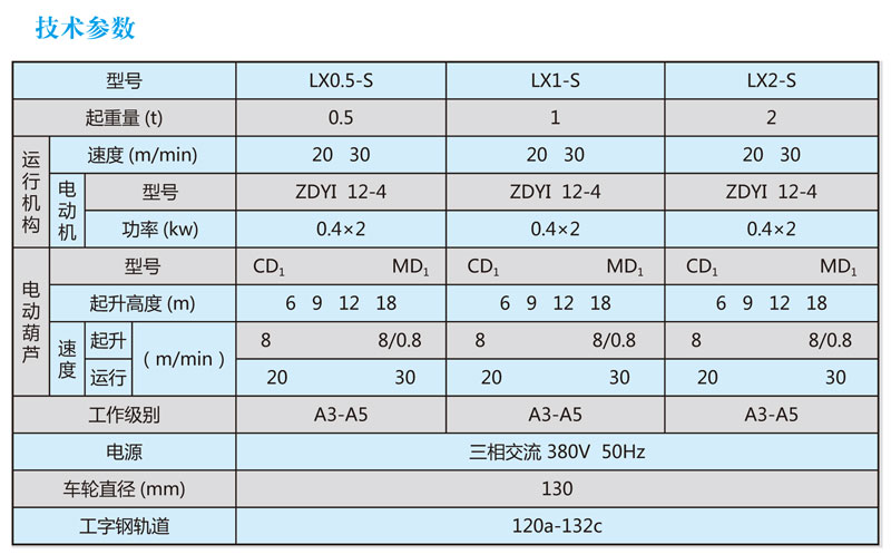 LX型與CD1型、MD1型電動葫蘆配套使用,成為一種有軌運行的輕小型起重機。用于機械裝配及倉庫等場所,起重量為1-10T,跨度為3.5-15.5米,工作級別為A3,工作環境溫度為-25℃--40℃。